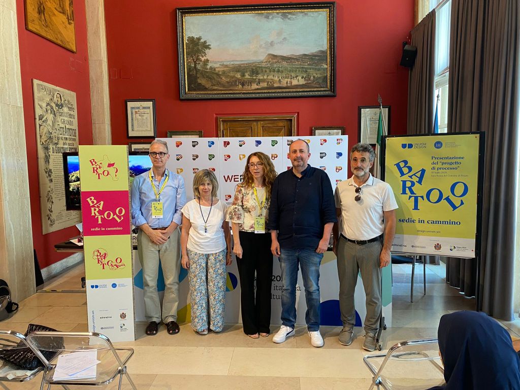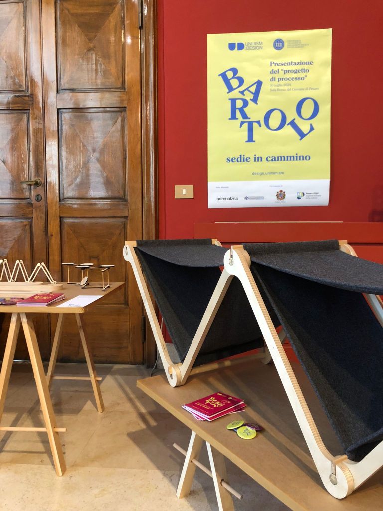‘Bartolo: sedie in cammino’ – il nome si ispira all’elemento naturale che più connota la bellezza di Pesaro 2024 (il Parco San Bartolo) – rappresenta innanzitutto un processo virtuoso e partecipato tra comunità educante e comunità di apprendimento, tra università, scuola, cittadini e aziende del territorio. Durato 4 anni, il percorso di progettazione è stato condotto dal Centro di Ricerca in Design di Comunità – DDC dell’Università degli Studi di San Marino; il primo e più importante risultato è un sistema costituito da articolati arredi gioco per bambini e sedute pieghevoli per esterni in legno di faggio e ciliegio, personalizzabili e adattabili a vari terreni e contesti. Si tratta di sistemi relazionanti creati in collaborazione con l’Istituto Tecnico Economico Tecnologico Bramante Genga e l’azienda Adrenalina di Pesaro. ‘Bartolo’ sarà prodotto in serie limitata per Pesaro 2024 e potrà essere usato in vari contesti, all’aperto per eventi temporanei.