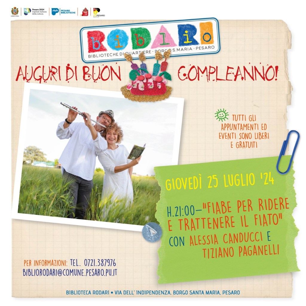 Giovedì25 luglio la Biblioteca Rodari – Borgo Santa Maria compie 4 anni e per l’occasione festeggia nella sua bella sede e nel giardino tanto amato da chi la frequenta. La proposta è fatta di due giornate speciali con un programma ricco: una mostra e un laboratorio di Marianna Balducci, il mercatino per il baratto con picnic finale, il dolce concorso e la perfomance imperdibile del duo composto da Alessia Canducci e Tiziano Paganelli.