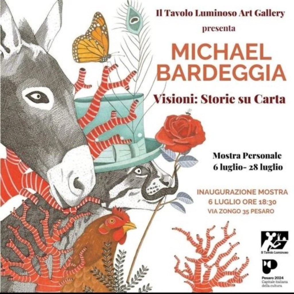 Giovedì 25 Luglio, alle ore 19,00, l’illustratore pesarese Michael Bardeggia, presente alla galleria Il Tavolo Luminoso, via Zongo 35 a Pesaro, con la sua mostra personale Visioni: Storie su carta, si presterà per la 1°sessione di firmacopie dei suoi albi illustrati, editi per Arka edizioni. Michael, è un illustratore di libri per l’infanzia, le sue suggestive e originali illustrazioni, hanno “raccontato” grandi uomini dell’arte e della letteratura (Salvador Dalì e Dante), come anche grandi classici, quale il Mago di OZ. L’ultimo suo albo illustrato “La nana del coqui’”, è stato addirittura pubblicato da una casa editrice portoricana. Per l’occasione avrete modo di visitare la sua personale mostra (per chi ancora non lo avesse fatto), dove sono presenti alcune delle sue tavole in originale degli albi citati e alcune delle sue incisioni con la tecnica dell’acquaforte e conoscere da vicino un giovane e promettente artista. La mostra resterà aperta fino al 2 Agosto, e rientra negli eventi di Pesaro 2024, Capitale italiana della cultura.