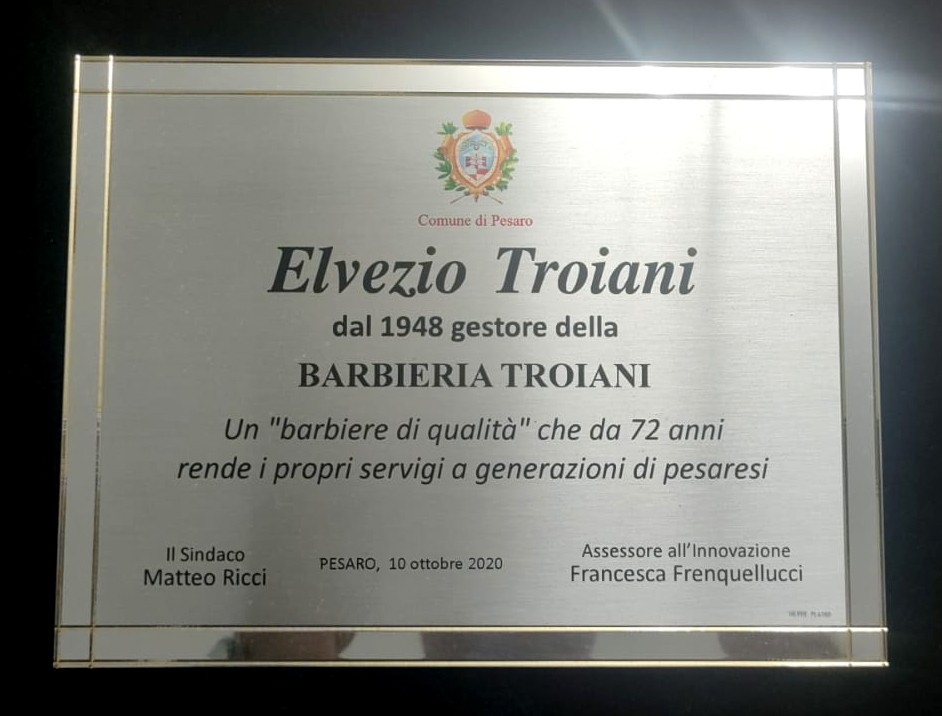 4 anni fa Elvezio Troiani aveva ricevuto dall’ex sindaco di Pesaro Matteo Ricci e dall’assessore Francesca Frenquellucci una targa di attestato al merito per i 72 anni della sua attività, portata da loro personalmente nel suo negozio.