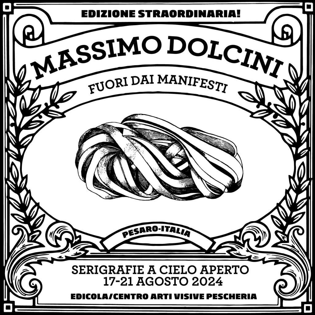 Tutti i cittadini sono invitati all’azione. Da una selezione di disegni di MD sono stati realizzati altrettanti telai pronti per stampare; esperti serigrafi e volontari guideranno il pubblico alla scoperta della stampa serigrafica. I partecipanti possono portare da casa quello che vogliono serigrafare: una carta particolare, uno strofinaccio, una maglietta, una shopper, un supporto qualsiasi; al resto pensa il team Massimo Dolcini. Tutto accadrà nella piazza della Creatività di corso XI settembre (di fronte alla Pescheria) decorata per l’occasione con una composizione serigrafica in bianco e nero.