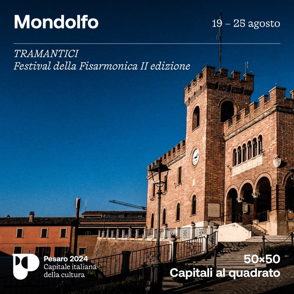 Dal 19 al 25 agosto è il Comune di Mondolfo il nuovo protagonista di ‘50×50: Capitali al quadrato’, il progetto simbolo di Pesaro 2024 che vede i cinquanta Comuni della Provincia di Pesaro e Urbino, a turno, Capitale per una settimana lungo tutto il 2024. La settimana coincide con la seconda edizione di TRAMANTICI Festival della Fisarmonica, un evento unico nel suo genere celebra la fisarmonica e tutti gli strumenti a mantice e che quest’anno – in occasione di Pesaro 2024 – si estende su più giorni ricchi di musica e racconti, offrendo un programma eccezionale voluto dall’Amministrazione Comunale sotta la direzione artistica di Roberto Lucanero con l’organizzazione esecutiva di DMP Concept/Senigallia e il supporto della Fondazione Carifano.