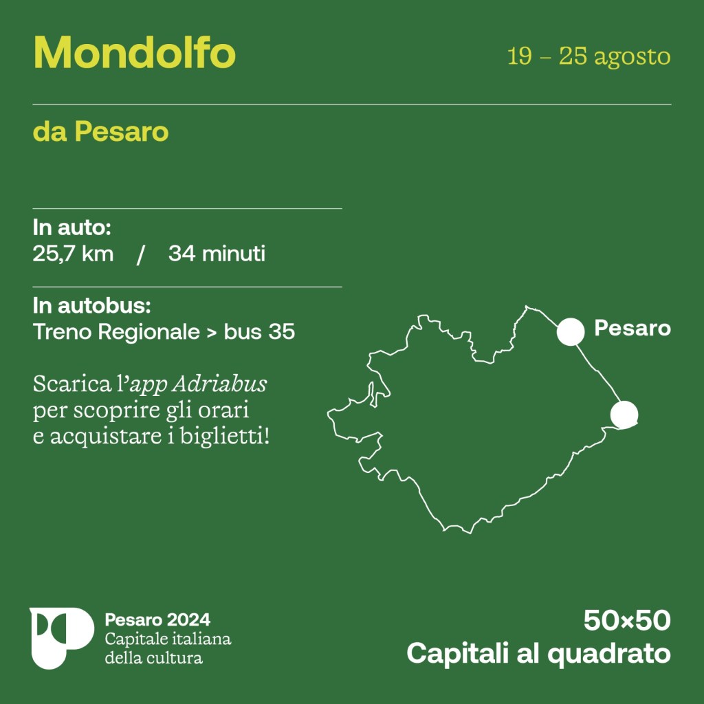 Nato nel segno di un metodo fortemente partecipato, il macro-progetto vede i cinquanta Comuni della Provincia di Pesaro e Urbino, ‘Capitale’ per una settimana lungo il 2024. Il ricco programma di 12 mesi tiene insieme oltre 350 soggetti grazie ad un inedito lavoro corale tra le amministrazioni sancito da un protocollo, coinvolge centinaia di artisti e creativi e rappresenta un invito al viaggio tra natura e cultura, alla scoperta di una terra policentrica e polifonica, tra mare e colline. 50×50 nasce da un’intelligenza collettiva che lavora anche sulle piccole comunità e intende il territorio non solo entro la cinta urbana ma come rete preziosa di relazioni e legami su un’area vasta e da ampliare: perché la Capitale della cultura è un’occasione per accrescere il capitale culturale di tutti i cittadini. Ponendo il focus sulle singole eccellenze, prende così forma il grande quadro di una provincia che vuole presentarsi al meglio all’Italia e al mondo con l’ambizione di essere un vero e proprio laboratorio di idee per le altre città che si candidano a Capitale italiana della cultura. Special Partner di progetto: Banca di Pesaro – Credito Cooperativo