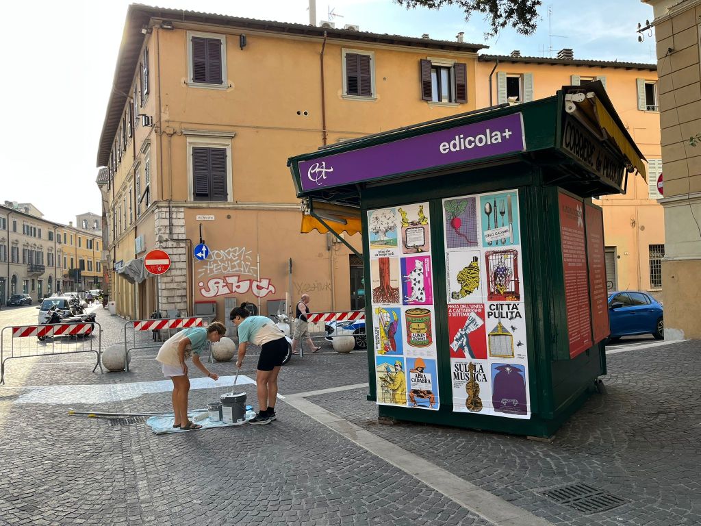Lavori in corso per il progetto di Pesaro 2024 dedicato a Massimo Dolcini. Sabato e domenica si conclude la decorazione del pavimento di piazza della Creatività con la stampa serigrafica in strada. Dal 19 al 21 agosto, laboratori per tutti a partire dai manifesti storici del grafico che – dopo 30 anni – prendono vita nello spazio urbano e dialogano con i cittadini.