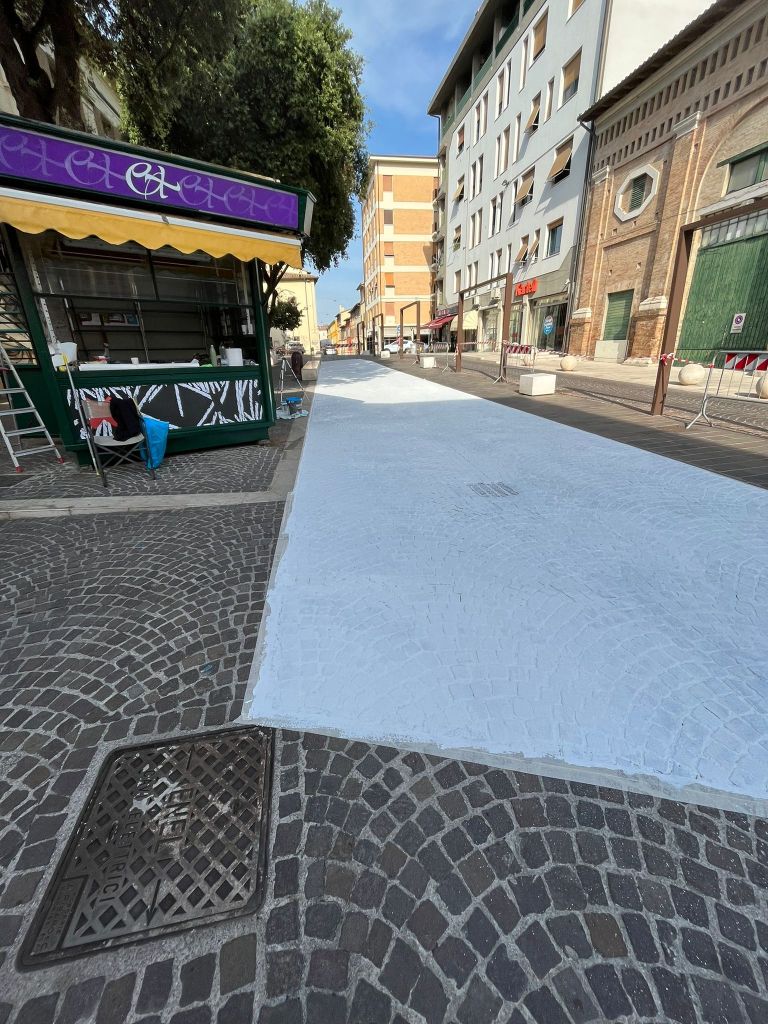 Per chi vuole sbirciare il cantiere in progress, le giornate sono quelle di sabato 17 e domenica 18 quando il tratto di strada di fronte alla Pescheria – fresca di vernice bianca – diventa un grande fondale su cui stampare in serigrafia. Domenica alle 19.30 l’inaugurazione dei lavori conclusi. Da lunedì 19 – fino al 21 – i cittadini sono invitati a partecipare ai laboratori serigrafici per tutti; previsti anche quelli per bambini a cura della libreria Le foglie d’oro. Mercoledì 21 il finissage con musica e parole.
