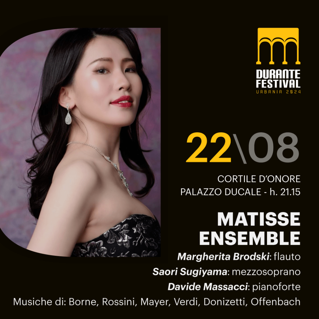 Giovedì 22 agosto a Urbania (Palazzo Ducale, ore 21.15) spazio ai giovani talenti con il Matisse Ensemble, composto dalla flautista Margherita Brodski, il mezzosoprano Saori Sugiyama e Davide Massacci al pianoforte.