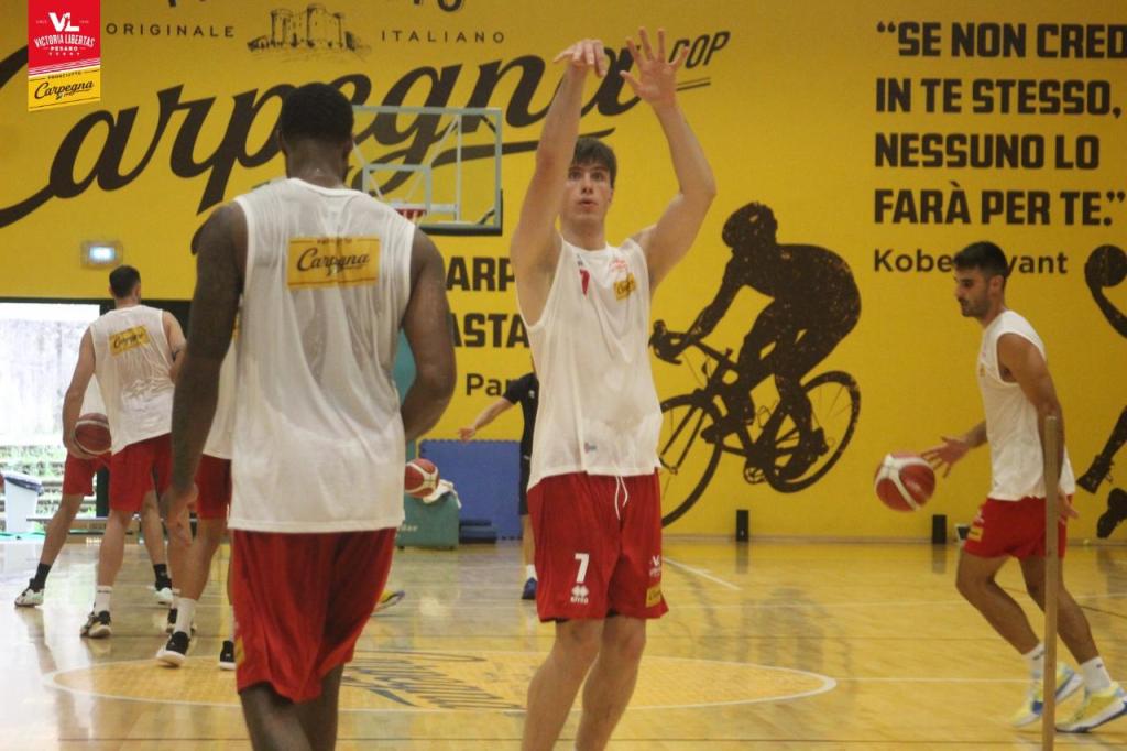 Pesaro: allenamento unico in tarda mattinata per i ragazzi biancorossi, agli ordini dello staff tecnico guidato dai coach Sacripanti, Baioni e Pentucci, oltre che per la parte atletica dal prof. Roberto Venerandi e dall’assistente Davide Tamburini.