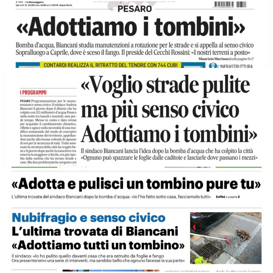 Nei suoi primi 100 giorni, Pesaro ha vissuto le sette piaghe dell’Egitto perché, sono stati scoperti numerosi inciuci fatti dalla maggioranza che, ricordo a tutti è composta attualmente quasi dalle medesime persone dell’ex Giunta . Si è passati da un Belloni che in uno slancio di verità ha dichiarato apertamente, la falsità di una determina in particolare, quasi che nella pubblica amministrazione si potesse giocare con i soldi falsi del gioco del Monopoli. E così, tra il compiere un’opera Maestra seguendo la stella polare, si è giunti a dover adottare un tombino! E appena il caso di evidenziare che il dl 285/92 stabilisce che il marciapiede e le strade tranne quelle private, sono suolo pubblico e pertanto la loro manutenzione ricade su chi ne ha la proprietà, ovvero il Comune. Per tale motivo, i cittadini non possono fare nessuna attività di pulizia e manutenzione su di essi perché rischiano di essere addirittura sottoposti a sanzione. Voglio sottolineare peraltro che, laddove qualcuno durante le operazioni di pulizia delle feritoie e non tombini come erroneamente chiamati dal primo cittadino, dovesse rompere qualcosa, si ritroverebbe fino anche a risarcire i danni al Comune.