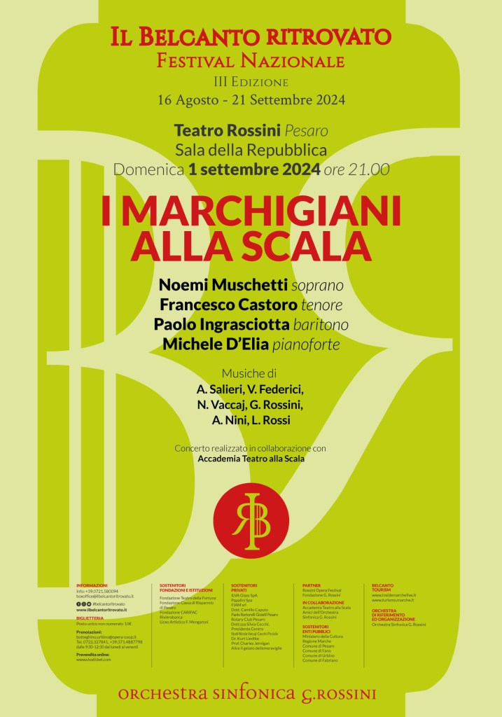 Il Festival Nazionale Il Belcanto ritrovato – edizione 2024, chiuderà la sua programmazione con un concerto del tutto particolare dal titolo “I Marchigiani alla Scala” realizzato in collaborazione con l’Accademia Teatro alla Scala di Milano. Questo concerto per canto e pianoforte, che si terrà a Pesaro il giorno 1 settembre 2024 alle ore 21.00 nella Sala della Repubblica del Teatro Rossini, è dedicato ai compositori marchigiani Vincenzo Federici, Nicola Vaccaj, Lauro Rossi e Alessandro Nini con alcune gemme musicali in prima esecuzione mondiale in epoca moderna tratte da loro opere che esordirono proprio nell’Ottocento al Teatro alla Scala di Milano. Ne sono interpreti i Solisti dell’Accademia di perfezionamento per cantanti lirici del Teatro alla Scala Noemi Muschetti (soprano), Francesco Castoro (tenore) e Paolo Ingrasciotta (baritono), accompagnati da Michele D’Elia.