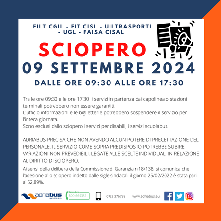 Adriabus informa che il 9 Settembre 2024 il sindacato FILT CGIL – FIT CISL – UILTRASPORTI – UGL – FAISA CISAL ha indetto uno sciopero