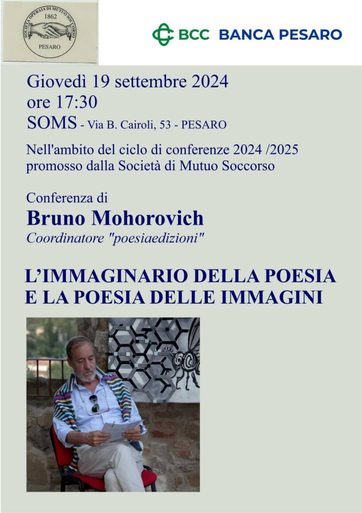 Il primo appuntamento della tre giorni, che vede impegnato il coordinatore della Bertoni, inizia a Pesaro, giovedì 19 settembre, alle ore 17,30, dove, presso la sede della SOMS in via Cairoli 53, inaugurerà il ciclo di conferenze della Società Operaia di Mutuo Soccorso, presieduta dal poeta dialettale Emilio Melchiorri e coadiuvato dal giornalista Paolo Montanari, che presenterà una relazione avente per tema “L’imaginario della poesia e la poesia delle immagini”. L’autore farà un exursus sul senso della poesia per concludere il suo intervento con una proiezione di slides di carattere cinematografico, le quali fanno riferimento o attingono alla poesia.