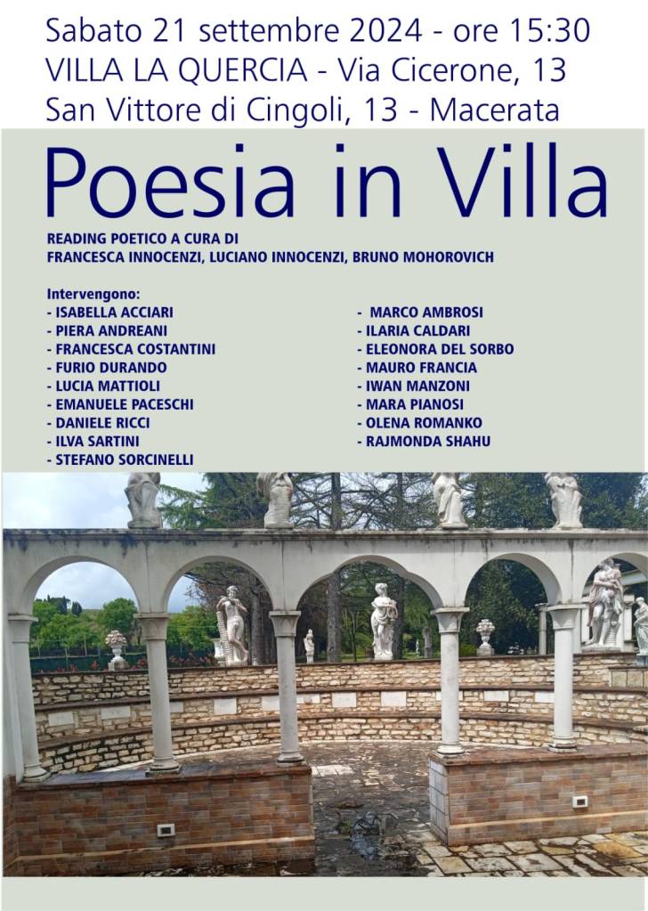Infine, sabato 21, a San Vittore di Cingoli (Macerata), presso Villa La Quercia, via Cicerone 13 di proprietà delLa famiglia Innocenzi, darà vita ad un reading poetico che vanta la presenza di una ventina di autori provenienti dalla nostra regione e da regioni limitrofe. Fra gli autori presenti, provenienti da Pesaro e Fano, Stefano Sorcinelli, Ilva Sartini, Emanuele Paceschi, Eleonora Del Sorbo, Lucia Mattioli, Francesca Costantini e l’artista Mara Pianosi che, con le sue opere pittoriche, ha contribuito ad illustrare molti libri della Bertoni, Daniele Ricci oltre, naturalmente, ai padroni di casa Francesca e Luciano Innocenzi che declameranno i loro versi con Bruno Mohorovich curatore dell’evento.