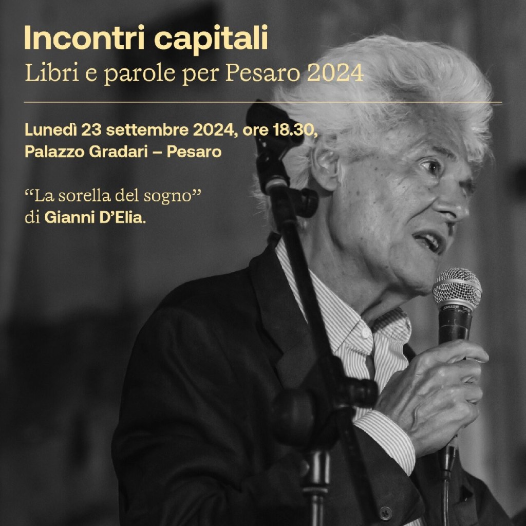 Tornano, dopo la pausa estiva, gli Incontri Capitali promossi da Pesaro 2024, e si comincia con il poeta Gianni D’Elia che lunedì 23 settembre (ore 18.30) presenterà a Palazzo Gradari, insieme al giornalista Alberto Pancrazi, il suo ultimo libro “La sorella del sogno” (Luca Sossella Editore).