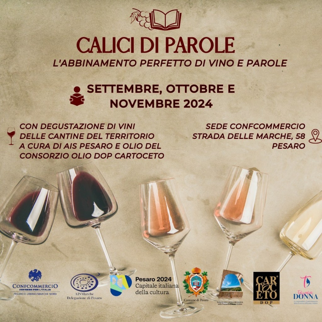L’abbinamento perfetto di vino e parole. Torna la seconda stagione di “Calici di parole”, la rassegna che unisce la presentazione di libri alla degustazione di vini del territorio e dell’olio Dop di Cartoceto.