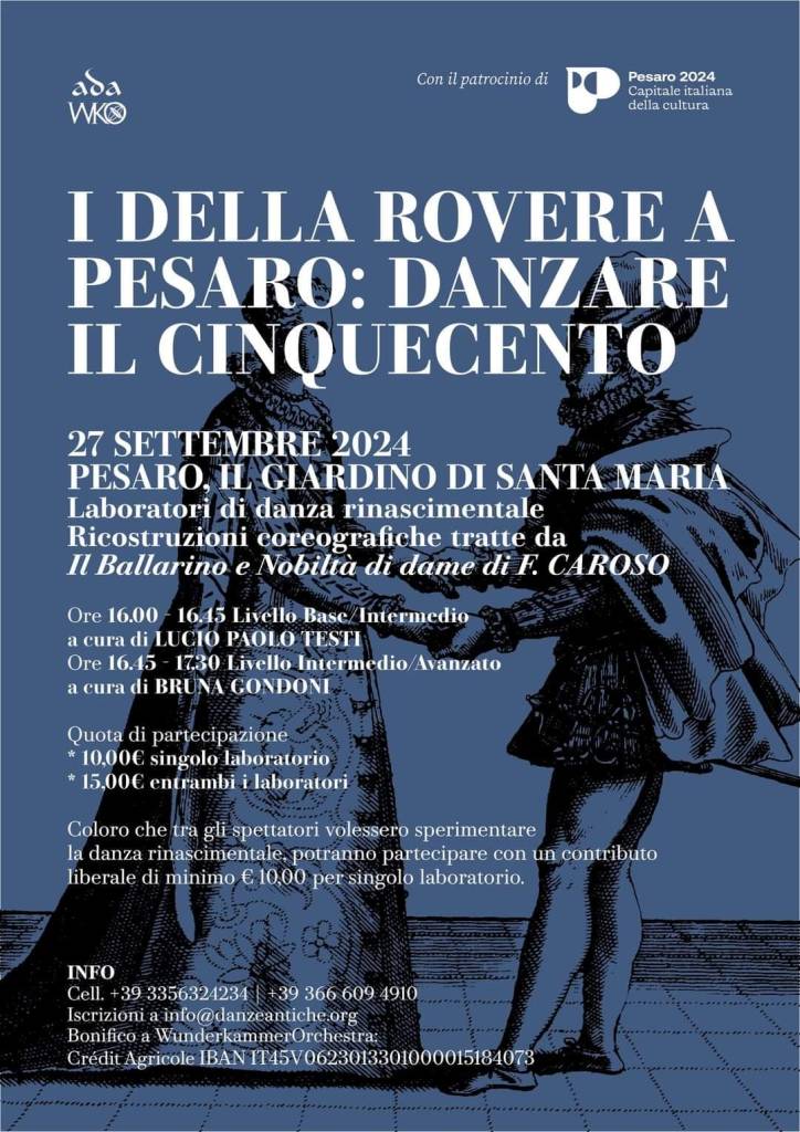 Il pomeriggiodi venerdì 27 settembre sarà dedicato, dalle 16.00 alle 17.30, ai laboratori di danza del XVI secolo “I Della Rovere a Pesaro: Danzare il Rinascimento” con ricostruzioni coreografiche tratte da Il Ballarino e Nobiltà di dame di F. Caroso, presso il Giardino di Santa Maria ( via Santa Maria delle Fabbrecce, 29): livello base/intermedio (ore 16.00 – 16.45) a cura di Lucio Paolo Testi, livello avanzato (ore 16.45 – 17.30) a cura di Bruna Gondoni. Alle 18.00 sarà la volta di una visita guidata ai Musei Civici di Pesaro (Palazzo Mosca).