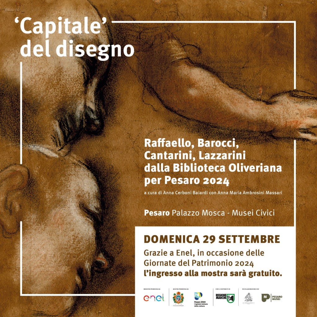 Come Gold Partner di Pesaro 2024 – Capitale italiana della cultura, Enel sostiene tutto il palinsesto di iniziative e progetti dell’anno in corso. Nell’ambito di questa preziosa partnership, Enel ha deciso di offrire l’ingresso gratuito alla mostra ‘Capitale’ del disegno. Raffaello, Barocci, Cantarini, Lazzarini dalla Biblioteca Oliveriana per Pesaro 2024’ per il pubblico che domenica 29 settembre si presenterà alla biglietteria di Palazzo Mosca – Musei Civici (orario 10-13, 16-19). ). La data non è casuale perché coincide con il weekend delle Giornate europee del patrimonio, la più partecipata manifestazione culturale promossa dal Consiglio d’Europa e dalla Commissione Europea