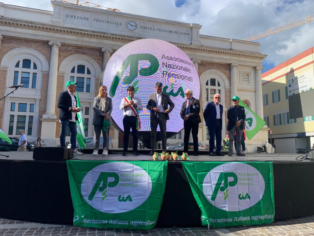 Sul palco di Pesaro della XIII Festa Interregionale del Pensionato i rappresentanti delle associazioni CIA: Sabina Pesci, presidente CIA Pesaro; Cristiano Fini, presidente CIA Agricoltori Italiani; Giancarlo Sperindio, coordinatore CUPLA Marche; Nevio Lavagnoli, presidente ANP CIA Marche; i presidenti Anp-CIA Abruzzo, Lazio, Molise, Toscana Sardegna e Umbria. Coordinamento di Maurizio Romagnoli, presidente ANP CIA Pesaro.