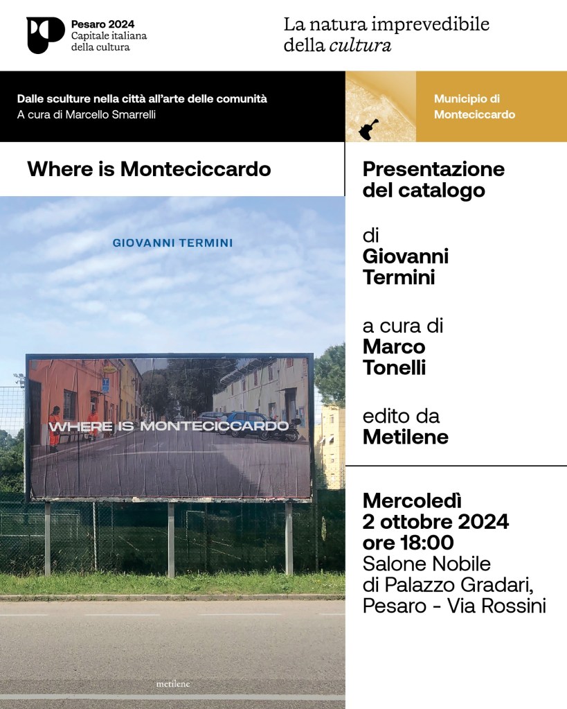 Mercoledì 2 ottobre alle 18, il Salone Pallerini di Palazzo Gradari accoglie la presentazione del libro Giovanni Termini. Where is Monteciccardo (Metilene edizioni)a cura di Marco Tonelli. Il catalogo documenta l’omonimo intervento artistico diffuso nel territorio tra Pesaro e Monteciccardo, e le sue frazioni Villa Betti e Montegaudio, Monte Santa Maria e Villa Ugolini, all’interno del progetto di Pesaro 2024 ‘Dalle sculture nella città all’arte delle comunità’ che si interroga sul ruolo dell’arte nello spazio pubblico.