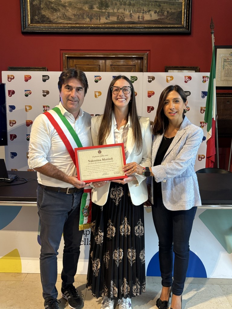 Premiata assieme a Pianosi anche la giovane Valentina Mattioli che si è presa cura degli atleti durante i Giochi Olimpici e Paralimpici 2024: «Dalla Pesaro 2024 a Parigi 2024; Valentina è cresciuta in una famiglia dove lo sport è nel dna, prima da atleta e poi da organizzatrice, ha contribuito a portare nel mondo il nome di Pesaro. Grazie Valentina e Riccardo, per tutto. Siete due giovani da prendere come esempio di quanto la determinazione, l’impegno e la passione siano fondamentali per poter raggiungere livelli sportivi e lavorativi così improntanti. Per questo – aggiungono -, invitiamo i giovani a fare sport a prescindere dal risultato, perché questo è importante per la crescita fisica e personale degli individui».