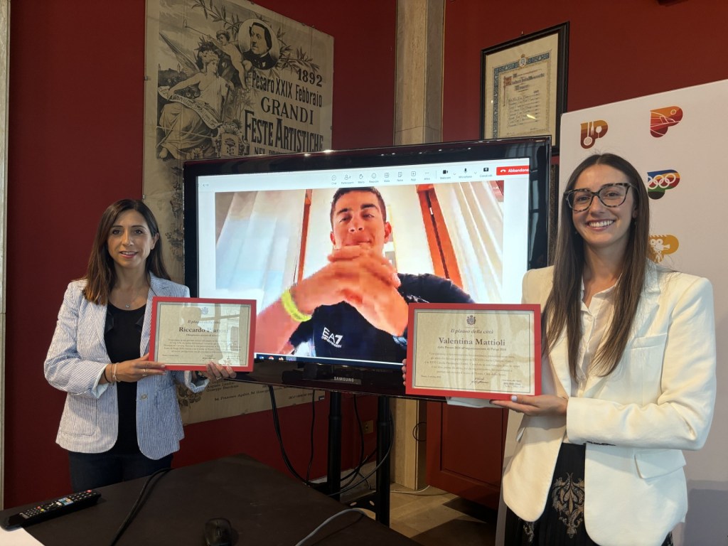 Riccardo Pianosi, 19 anni, e Valentina Mattioli, 26 anni, sono stati premiati questa mattina dal sindaco di Pesaro Andrea Biancani e dall’assessora allo Sport Mila Della Dora per la loro partecipazione, in vesti diverse, ai Giochi Olimpici Estivi di Parigi 2024.