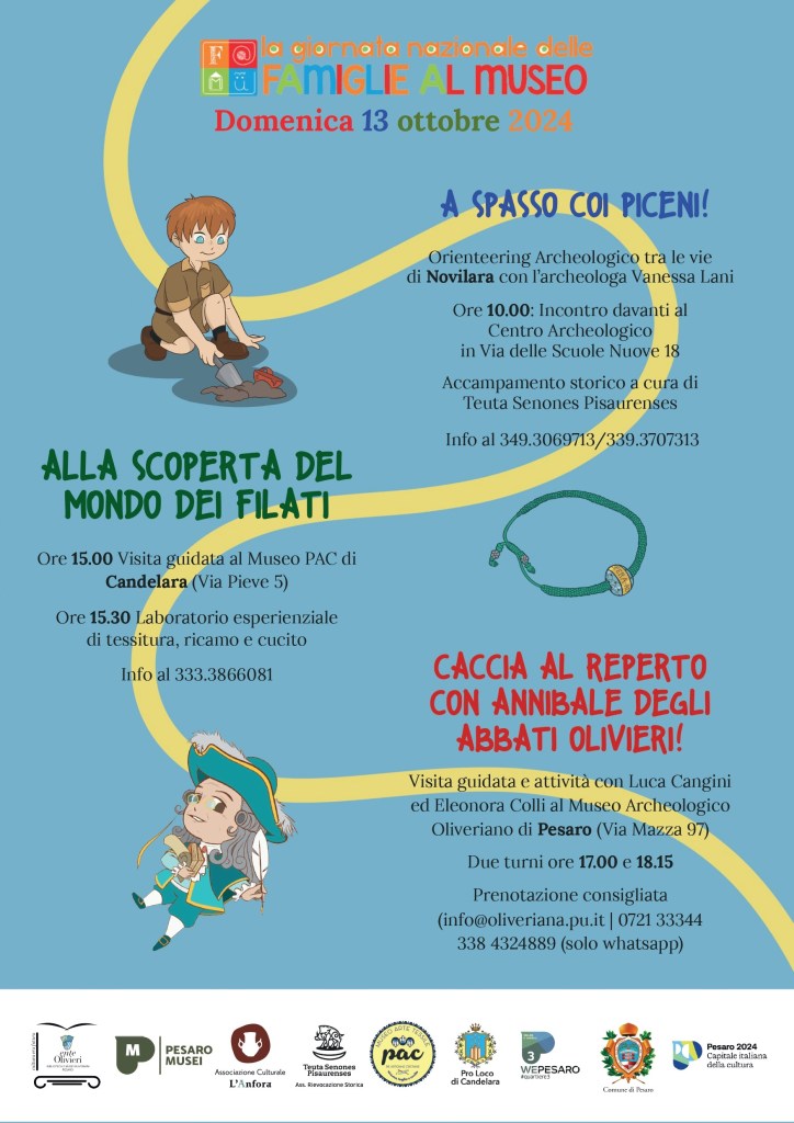 “E’ una giornata speciale, pensata per i più piccoli e i loro genitori e per far sì che si possa vivere il Museo in modo non canonico, in una dimensione giocosa adatta anche a chi non è solito frequentare istituzioni museali”spiega Brunella Paolini, direttrice Ente Olivieri “la giornata avrà un taglio trasversale, una sorta di viaggio che tocca i borghi di Novilara, con cui abbiamo un legame inscindibile essendo il luogo di ritrovamentodella Necropoli conservata presso il nostro Museo Archeologico , e Candelara, sede del Museo PAC, fino ad arrivare a Pesaro: vedere i più piccoli animare le Sale del Museo è sempre un’emozione indescrivibile”.