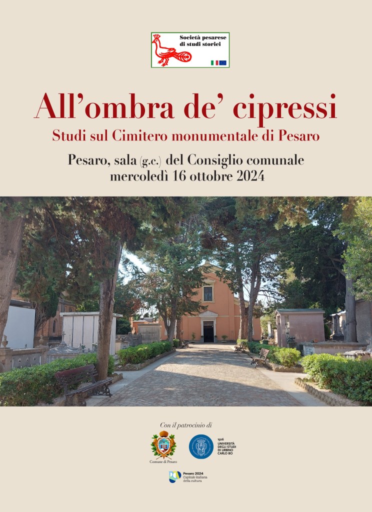 Con l’occasione di Pesaro 2024 Capitale italiana della cultura la Società pesarese di studi storici promuove un convegno di studi sulle vicende storiche e urbanistiche del Cimitero monumentale, sullo stile delle lapidi, sugli arredi funebri, sulle tombe di famiglia come luogo di autorappresentazione, ecc., sino a valutare la possibilità che il cimitero pesarese sia inserito nell’ambito di un oggi diffuso dark tourism.
