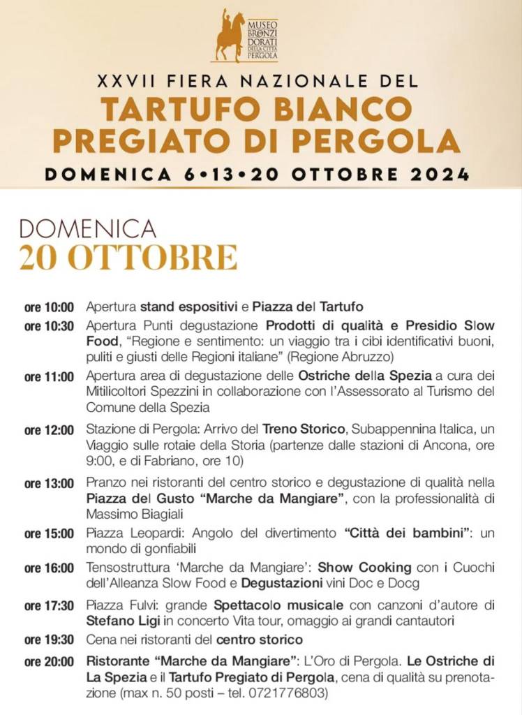 PERGOLA (PESARO URBINO) – Pergola è pronta a calare il tris. Dopo l’enorme successo delle prime due giornate, domenica 20 ottobre terzo e ultimo appuntamento della Fiera Nazionale del Tartufo Bianco Pregiato che quest’anno nella città dei Bronzi dorati viaggia nel segno dello slogan “The Unexpected Marche – Le Marche che non ti aspetti”.