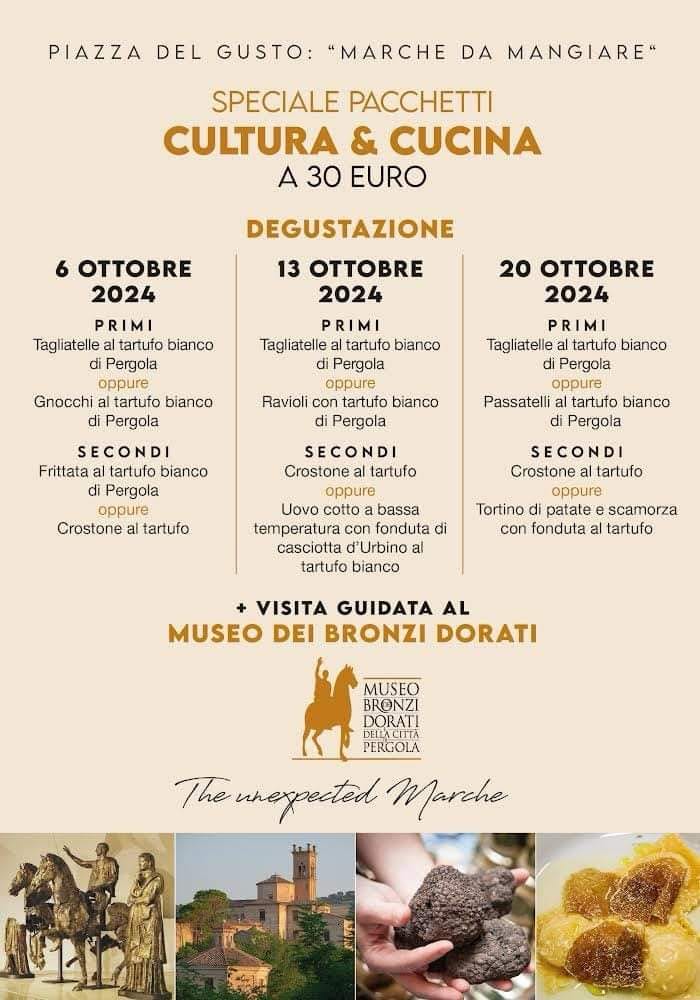 Si potrà pranzare nei ristoranti del centro storico e nella Piazza del Gusto “Marche da Mangiare”, con la professionalità di Massimo Biagiali. I visitatori potranno immergersi nel gusto e nella bellezza con lo Speciale Pacchetto Cultura & Cucina: degustazione nella Piazza del Gusto e visita al Museo dei Bronzi e della Città di Pergola.