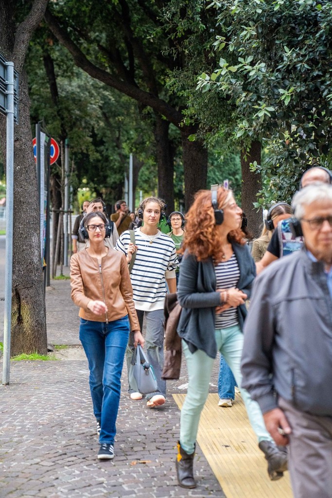 Il lavoro ha indagato il rapporto tra l’intelligenza artificiale e la prevedibilità umana attraverso un percorso lungo la città (3,5 Km circa) per un vero e proprio viaggio urbano collettivo. Un gruppo di 40 persone è stato coinvolto nell’esperimento di passeggiare per la città indossando un paio di cuffie, guidato da una voce registrata. L’esperienza ha voluto interrogarsi su come vengono prese le decisioni collettive e come agisce l’essere umano quando è guidato da un algoritmo.