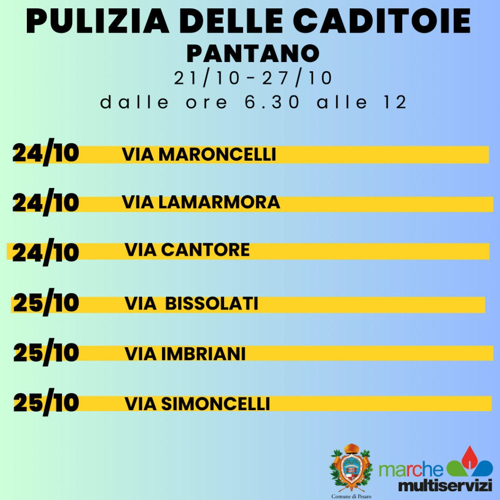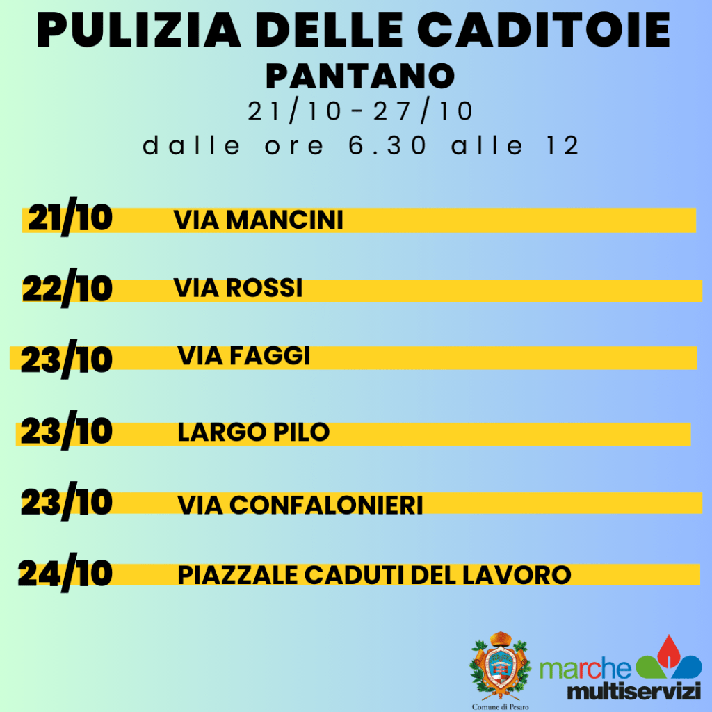 Continua la pulizia delle caditoie su suolo pubblico della città. Ecco il calendario degli interventi di Marche Multiservizi dal 21 al 27 ottobre a Pantano.