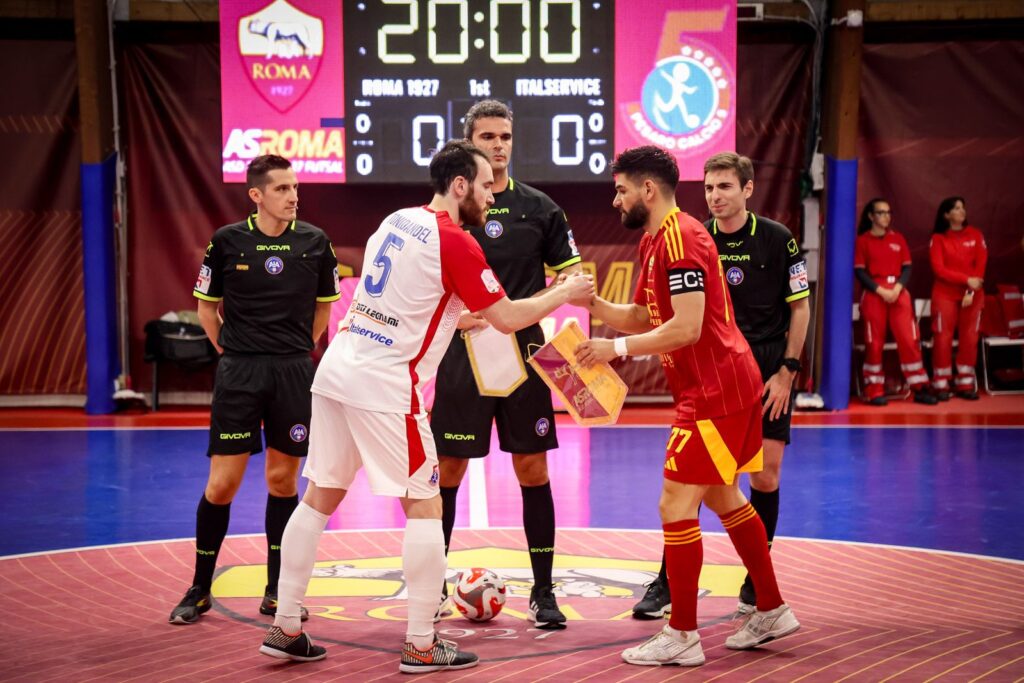 IL MATCH – Starting five biancorosso con Ricordi tra i pali, Tonidandel, Wittig, Saponara e Barichello. Dopo qualche minuto entra Oitomeia e colpisce subito un palo. È il preludio al gol di Galliani, abile a capitalizzare un’indecisione difensiva e spingere in tap-in la sfera oltre la linea bianca. Brivido poco dopo con Wittig che rischia quasi l’autorete, poco dopo ecco il raddoppio: Barichello accelera, brucia l’avversario e calcia, la difesa capitolina respinge, ma Gomez è prontissimo da distanza ravvicinata, 0-2. La reazione giallorossa è rabbiosa. Sale in cattedra Dimas che prima accorcia da calcio di punizione e poi impatta sfoderando una super-giocata. 2-2, tutto da rifare. Ora la gara è frizzante. Ceccarelli scheggia il palo, medesima sorte per Wittig prima e Oitomeia poi. Al 17’ arriva l’espulsione di Ricordi che allunga le mani fuori area per deviare un pallonetto (Manservigi al suo posto). Episodio che cambia l’inerzia del match. La Roma aumenta l’intensità e con Murilo, ben posizionato vicino al palo, trova il vantaggio. Poco dopo, altra azione di pregio per i padroni di casa che sull’asse Dimas-Biscossi fissano il punteggio della prima frazione sul 4-2.