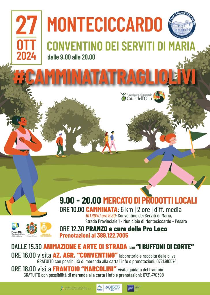 La Giornata Nazionale della camminata tra gli olivi, a Monteciccardo, si svolgerà a partire dalle ore 9 con l’apertura del mercato di produttori e delle aziende locali (fino alle ore 20, dalle 16 alle 20 laboratori a cura dei produttori e artigiani presenti) che esporranno i prodotti legati all’agricoltura nella cornice storica del chiostro del Conventino Serviti di Maria. Da qui alle 10 partirà la “Camminata tra gli Olivi”, un percorso ad anello, guidato da esperti olivicoltori del territorio, che si svilupperà attraverso olivete e aree d’interesse culturale. Il rientro è previsto al Conventino intorno alle ore 12.30, quando sarà possibile ristorarsi con i piatti a cura della Proloco di Monteciccardo (su prenotazione al 389.1227005, anche WhatsApp). Dalle 15, il Chiostro proporrà momenti d’intrattenimento con artisti di strada e racconti della tradizione; per tutti, anche la possibilità di visitare la mostra permanente “Appunti per una rinascita” allestita nelle sale del centro d’arte contemporaneo del Conventino Serviti di Maria.