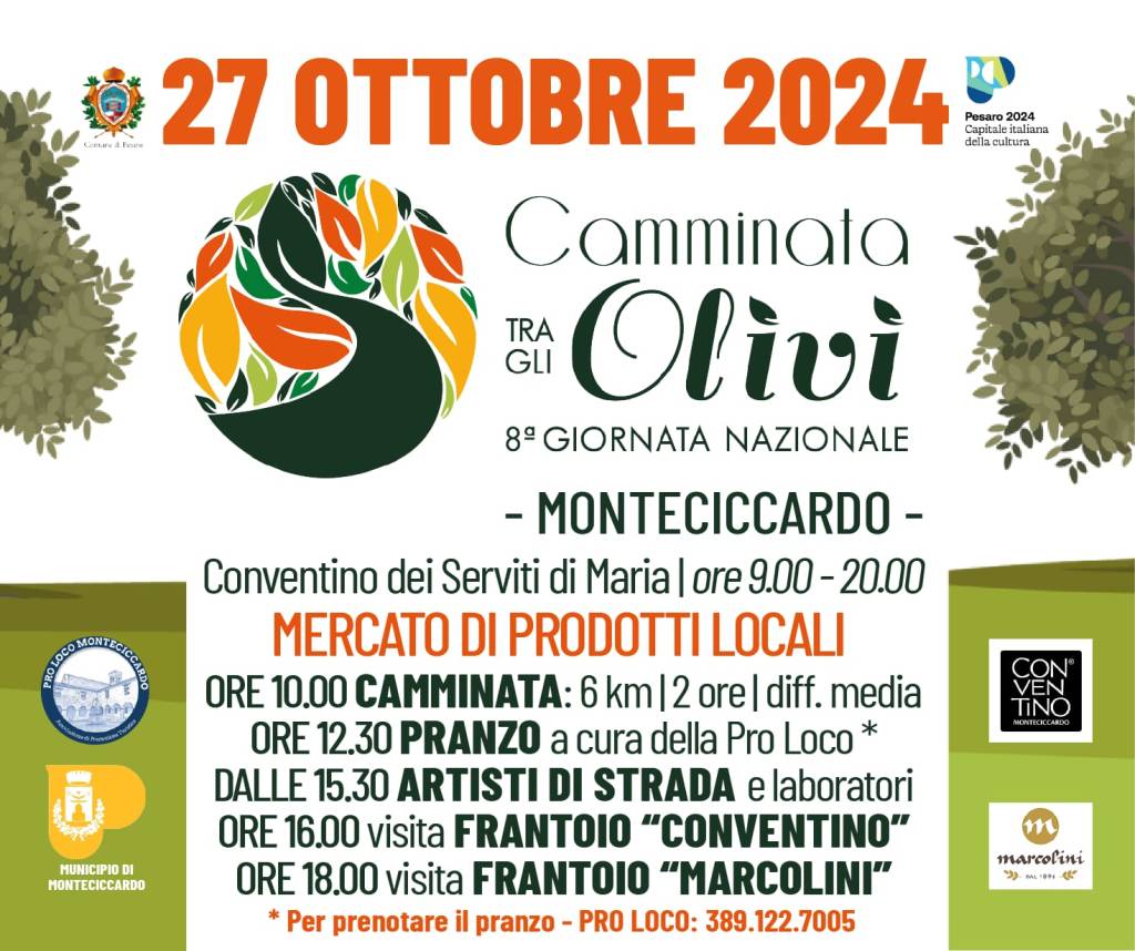 I colori e i profumi dell’“oro verde”, i panorami unici regalati dalle più belle olivete delle colline pesaresi, la vivacità del mercato dei produttori locali, il rumore, gli odori e i sapori unici dei frantoi, le canzoni popolari, il pranzo con i piatti tipici del territorio. Sono gli ingredienti della “Camminata tra gli Olivi” in programma domenica 27 ottobre nel Municipio di Monteciccardo.