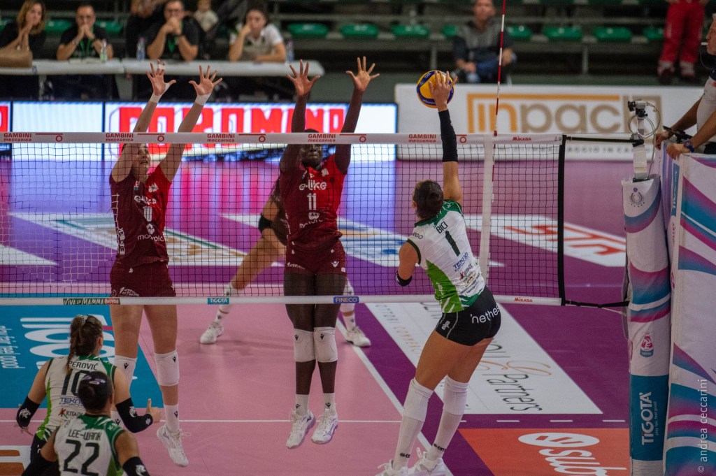 La Cda Talmassons ha conquistato nella sorpresa generale la promozione in A1 nei play-off dello scorso anno, ed ha cominciato con grande determinazione il suo primo, storico campionato in massima serie. Subito riflettori sulle due ex-tigri: la centrale Alexandra Botezat, a Vallefoglia nella prima stagione di A1, e la schiacciatrice Alice Pamio, che della conquista della A1 fu una delle principali bocche da fuoco. Coach Leonardo Barbieri, il condottiero dell’impresa delle friulane, quest’anno ritrova la palleggiatrice che ha guidato la squadra al successo, la nigeriana Chidera Blessing Eze, cui darà man forte, all’occorrenza, la diciottenne Rebecca Feruglio, nata nel vivaio della società. Le punte di diamante, in attacco, sono la schiacciatrice russa Yana Shcherban, al quarto anno in A1 dopo Casalmaggiore, Scandicci e Trento, e l’opposto ucraino Anastasiia Kraiduba, braccio pesante l’anno scorso a Firenze. Alle spalle di Kraiduba, la diciannovenne riminese Nicole Piomboni. Gli altri due posti 4 sono la greca Olga Stranzali, a Cuneo nel 2020/21 con Andrea Pistola, e Bianca Bucciarelli, l’anno scorso negli Stati Uniti alla Seton Hall University. Al centro, accanto a Botezat, la serba Jovana Kocic, l’anno scorso in Romania alla Alba-Blaj, e la ventenne bresciana Islam Gannar, già al Club Italia e l’anno scorso in A2 a Olbia. I liberi sono Martina Ferrara, nella scorsa stagione sempre in A1 a Roma, e la giovanissima Sofia Gazzola, classe 2006, dalla B1 di Piacenza.