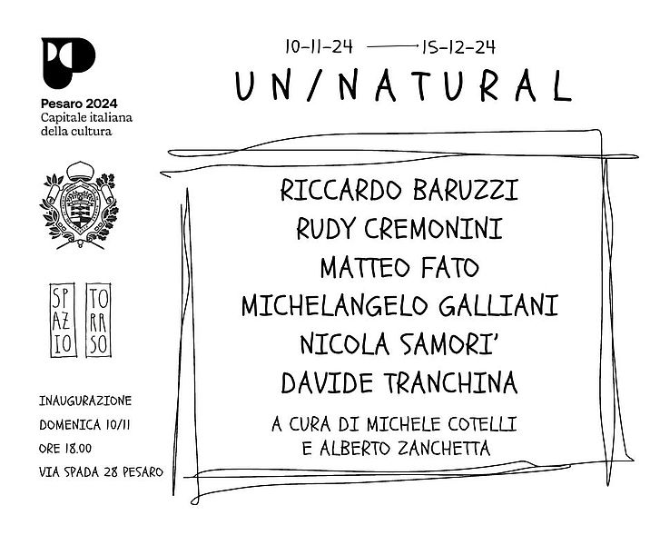 Domenica 10 novembre (alle 18), presso TORRSO (via Spada 28) inaugura l’ultimo appuntamento di UN/NATURAL la rassegna espositiva pensata per Pesaro 2024; l’evento vuol essere la summa conclusiva del discorso intavolato durante l’anno nello spazio indipendente pesarese. Gli argomenti attorno all’eterno binomio di Natura e Cultura che hanno avuto quattro focus tematici (io altro, naturale artificiale, corpo ambiente, organico inerte) sono qui ribaltati nei generi artistici che Riccardo Baruzzi, Rudy Cremonini, Matteo Fato, Michelangelo Galliani, Nicola Samorì e Davide Tranchina affrontano ognuno col proprio specifico linguaggio. Sono state selezionate dai curatori Alberto Zanchetta e Michele Cotelli sei opere, realizzate dal 2016 al 2024, una per ognuno degli autori nati tra il ’72 e l’81 tra l’Emilia Romagna e l’Abruzzo, per andare a sondare quel limite dove cultura e natura frizionano. Dopo secoli di scienza normalizzante dove qualsiasi fenomeno dell’esistenza ha trovato una spiegazione nelle svariate discipline di indagine, nelle arti sono invece fermentati interrogativi attorno al tema esistenziale della perdita: il senso nel mito e del rituale, la vita e la morte sono divenuti degli innaturali e i linguaggi artistici ne sono diventati il campo della sensibile manifestazione. In questa Hybris dell’uomo autocostruttore dell’universo, per testimoniare il proprio tempo agli artisti è divenuto necessario elaborare nuovi linguaggi per ridiscutere il ritratto, la natura morta, il paesaggio, la veduta di interni, la fotografia e la statuaria.