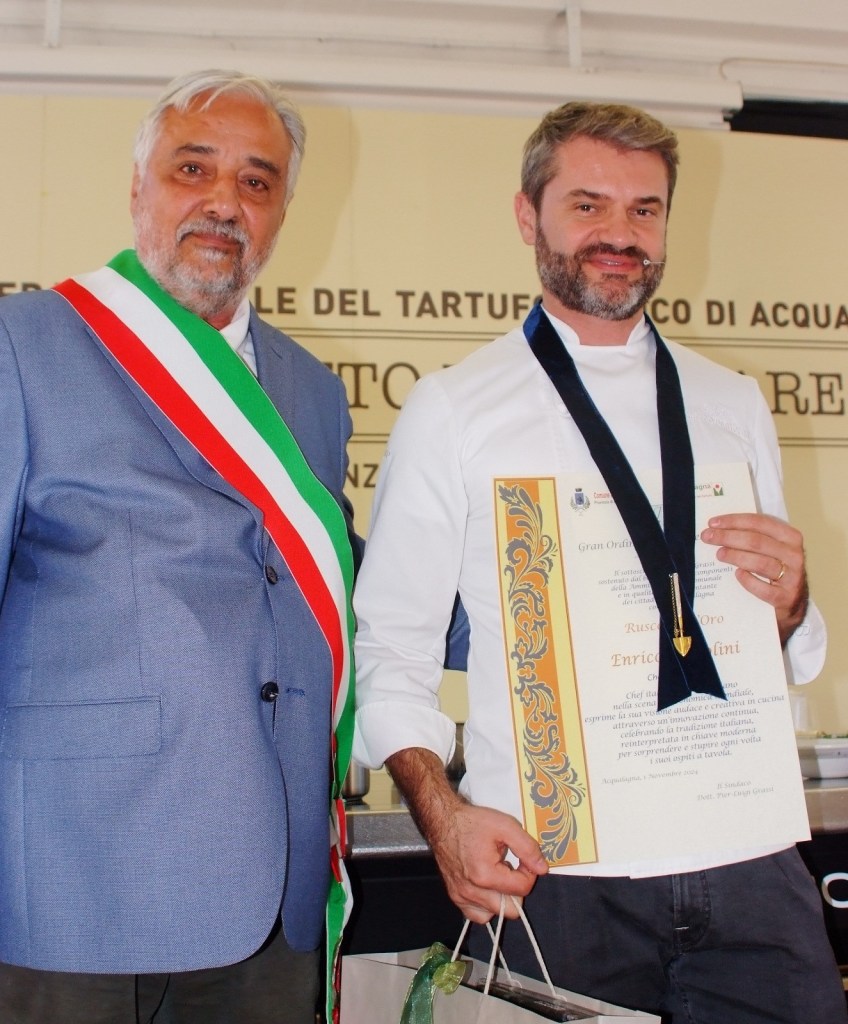 La giornata di sabato si è aperta con Enrico Bartolini, 13 stelle Michelin, nominato testimonial del tartufo di Acqualagna in Italia e nel mondo. “Chef italiano di primo piano nella scena gastronomica mondiale, esprime la sua visione audace e creativa in cucina attraverso un’innovazione continua, celebrando la tradizione italiana, reinterpretata in chiave moderna per sorprendere e stupire ogni volta i suoi ospiti a tavola”: questa la motivazione con la quale il Gran Ordine della Ruscella d’Orso rappresentata dal sindaco Pier Luigi Grassi, ha conferito la Ruscella d’Oro, la seconda di questa edizione dopo il direttore del Tg1 Chiocci, allo chef pluristellato. Una sinfonia di profumi scatenati dal suo cavallo di battaglia: Raviolo di agnello, nocciole e tartufo di Acqualagna, che ha conquistato cuore e palato dei visitatori. “Sono orgoglioso di rappresentare un gruppo di lavoratori che amano questo mestiere – ha dichiarato Chef Bartolini – Pertanto, questo riconoscimento ci offre lo stimolo di migliorarci e fare meglio”.