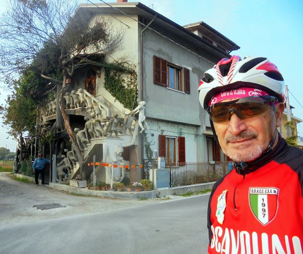 Alceo Pucci, classe 1950, nasce a Roncosambaccio, una terra di artisti, dato che anche un’altra persona del luogo, Giannino Vincenzi, ha realizzato sculture ubicate nei campi e nelle strade di questo centro minore dell’entroterra fanese. Alceo vive a Fano in Via Galileo Galilei, zona Sant’Orso nella Casa dell’Arte. L’arte a km 0 da lasciare ai posteri, sculture in legno, ferro, cemento e sabbia, un lavoro di riciclo con materiale di scarto altrui ma realizzato con amore. Corpi, mani, teste che avvolgono la casa come l’edera di ville signorili. Il Magistero d’Arte ai Carmini di Venezia che ha frequentato negli anni anni ’70 ha plasmato il talento della sua attività scultorea. Una persona iconica, ironica e, come si dice dalle sue parti, geniale.