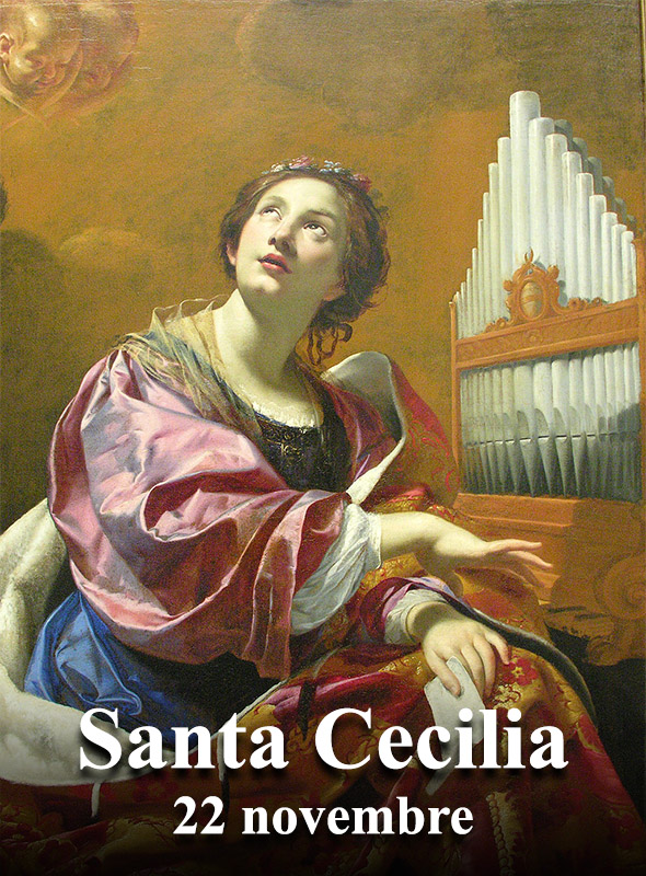 Santa Cecilia visse a Roma tra il II ed il III secolo ed era un’aristocratica romana convertita al cristianesimo, vergine e martire. Attualmente Santa Cecilia è la patrona della musica, dei musicisti e dei cantanti e la festa in suo onore ricorre il 22 novembre sia nella Chiesa cattolica che in quella ortodossa. La Chiesa a lei dedicata è la Basilica diSanta Cecilia in Trastevere, forse sorta dove sorgeva la sua casa, e dove subì il martirio. Nata a Roma da una nobile famiglia, Cecilia sposò il nobile Valeriano. Sembra che il giorno delle nozze nella casa di Cecilia risuonassero organi e lieti canti ai quali la vergine, accompagnandosi, cantava così: “Conserva o Signore immacolati il mio cuore e il mio corpo, affinché non resti confusa”. Da qui le è stato attribuito il fatto di essere protettrice dei musicanti. Una volta confidato allo sposo il suo voto, lo stesso si convertì al Cattolicesimo e nella prima notte di nozze ricevette il Battesimo per mano del Pontefice Urbano I. Tornato nella propria casa, Valeriano vide Cecilia prostrata nella preghiera con un giovane: era un Angelo che vegliava su di lei. Insospettito, il marito chiese una prova Di quella natura angelica che fece apparire due corone di fiori e le pose sul capo dei due sposi. Una volta diventato credente, Valeriano pregò il fratello Tiburzio, affinchè anche lui ricevesse la stessa grazia e così fu. A quell’epoca il giudice Almachio aveva proibito di seppellire i cadaveri dei Cristiani, ma i due fratelli, una volta convertiti, si dedicavano alla sepoltura dei corpi che trovavano lungo la loro strada. Per questo furono arrestati e, dopo aver redento l’ufficiale Massimo che doveva condurli in carcere, sopportarono atroci torture piuttosto che rinnegare Dio, per essere poi decapitati. Cecilia pregò sulla tomba del marito e di Massimo, anch’egli ucciso perché divenuto cristiano, ma venne chiamata al cospetto del giudice Almachio che ne ordinò la morte per soffocamento nel bagno di casa sua, anche se si narra che la Santa invece di morire cantava lodi al Signore. Convertita la pena in morte per decapitazione, il carnefice vibrò i tre colpi legali e, poichè ancora non era sopraggiunta la morte, la lasciò nel suo sangue. Papa Urbano I, sua guida spirituale, le diede una degna sepoltura nelle catacombe di San Callisto tra le tombe dei vescovi e consacrò la sua casa, trasformandola in una chiesa. Nell’821 le spoglie della donna furono traslate da papa Pasquale I nella Basilica di Santa Cecilia in Trastevere. Nel 1599, durante i restauri della Basilica, ordinati dal cardinale Paolo Emilio Sfondrati in occasione dell’imminente Giubileo del 1600, venne ritrovato un sarcofago con il corpo di Cecilia incorrotto ed emanante profumo di gigli e di rose. A questo punto il cardinale commissionò a Stefano Maderno una statua che riproducesse fedelmente l’aspetto e la posizione del corpo di Cecilia così com’era stato ritrovato, con la testa girata per la decapitazione, tre dita della mano destra a indicare la Trinità, un dito della sinistra a indicare Dio. La statua si trova oggi sotto l’altare centrale della chiesa.