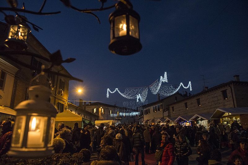 Il centro della festa sarà riservato come sempre al mercatino natalizio che si svolge nell’antico borgo medievale sulle colline attorno a Pesaro dove ogni sera la luce artificiale viene spenta per lasciare posto a migliaia di fiammelle accese. Un’atmosfera unica e suggestiva grazie a due spegnimenti programmati dell’illuminazione elettrica di 15 minuti ciascuno (alle 17.30 e 19.00).