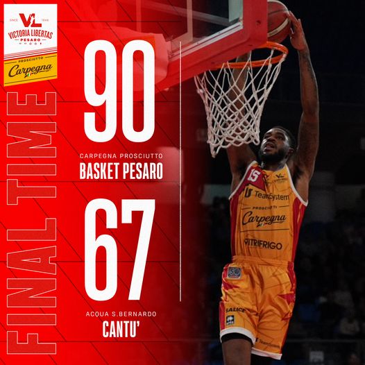 La Carpegna Prosciutto Basket Pesaro nella 14^ giornata del campionato di Serie A2 Old Wild West alla Vitrifrigo Arena contro l‘Acqua San Bernardo Cantù si regala una grande e importante vittoria: davanti a oltre 4000 spettatori finisce 90-67, con i biancorossi che salgono a quota 10 in classifica.