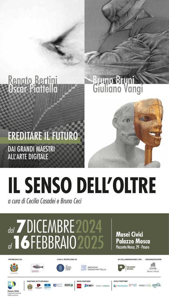 Apre venerdì 6 dicembre (ore 18.30) ai Musei Civici di Palazzo Mosca, la mostra ‘Il senso dell’oltre’ con le opere di Renato Bertini, Bruno Bruni, Oscar Piattella, Giuliano Vangi per Pesaro 2024. A cura di Cecilia Casadei e Bruno Ceci, l’esposizione è promossa dal Comune di Pesaro e Fondazione Pescheria – Centro Arti Visive; con il patrocinio di: Università degli Studi di Urbino Carlo Bo, Archivio Oscar Piattella ETS; in collaborazione con Pesaro Musei; organizzazione di Civita Mostre e Musei.