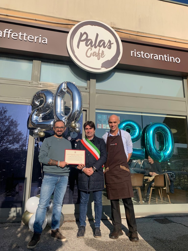 «Che piacere festeggiare i 20 anni del Palas Cafè insieme ai fondatori e titolari Enrico Pintonello e Matteo Gorini che hanno deciso di celebrare le due decadi di attività del loro locale, offrendo un buono per un caffè ai clienti abituali e non» ha detto il sindaco Andrea Biancani che stamattina ha consegnato il Plauso della città a Enrico Pintonello e Matteo Gorini, fondatori e titolari del locale di Torraccia.