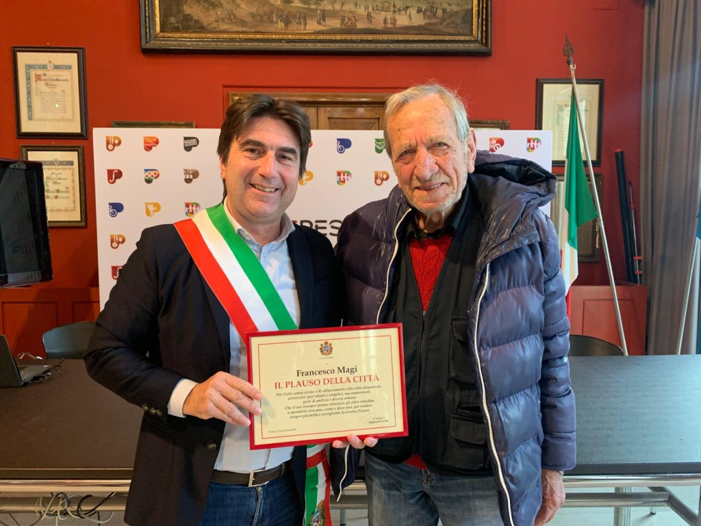 Classe 1939, portolotto Doc, cuore grande. A 85 anni Francesco Magi, continua, ogni mattina a rassettare il quartiere in cui abita, raccoglie le foglie, sistema gli spazi verdi, pulisce i tombini «quotidiani e semplici, quanto ammirevoli, gesti di pulizia e decoro urbano» che stamattina gli hanno valso il “Plauso della Città” consegnato dal sindaco Andrea Biancani. «È un premio che sono davvero felice di dare a Francesco – ha detto il primo cittadino durante la breve cerimonia in Comune a cui hanno partecipato i familiari e tanti amici e vicini di casa della zona porto – per l’alto senso civico e di attaccamento alla città che dimostra ogni giorno. L’augurio è che il suo esempio possa stimolare gli altri cittadini a spendersi ciascuno, come e dove può, per rendere sempre più bella e accogliente la nostra Pesaro».