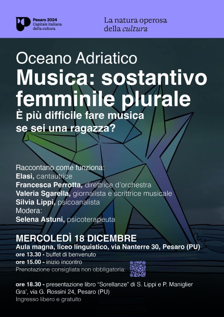 Mercoledì 18 dicembre doppia proposta del progetto di Pesaro 2024 ‘Oceano Adriatico’. Alle 15 nell’Aula Magna del Liceo Linguistico Mamiani, l’incontro dedicato a studentesse e studenti dal titolo ‘E’ più difficile fare musica se sei una ragazza’ per riflettere su cosa significa essere musiciste in Italia. Alle 18.30 al Gra’ la presentazione del libro Sorellanze. Per una psicoanalisi femminista di Silvia Lippi e Patrice Maniglier.