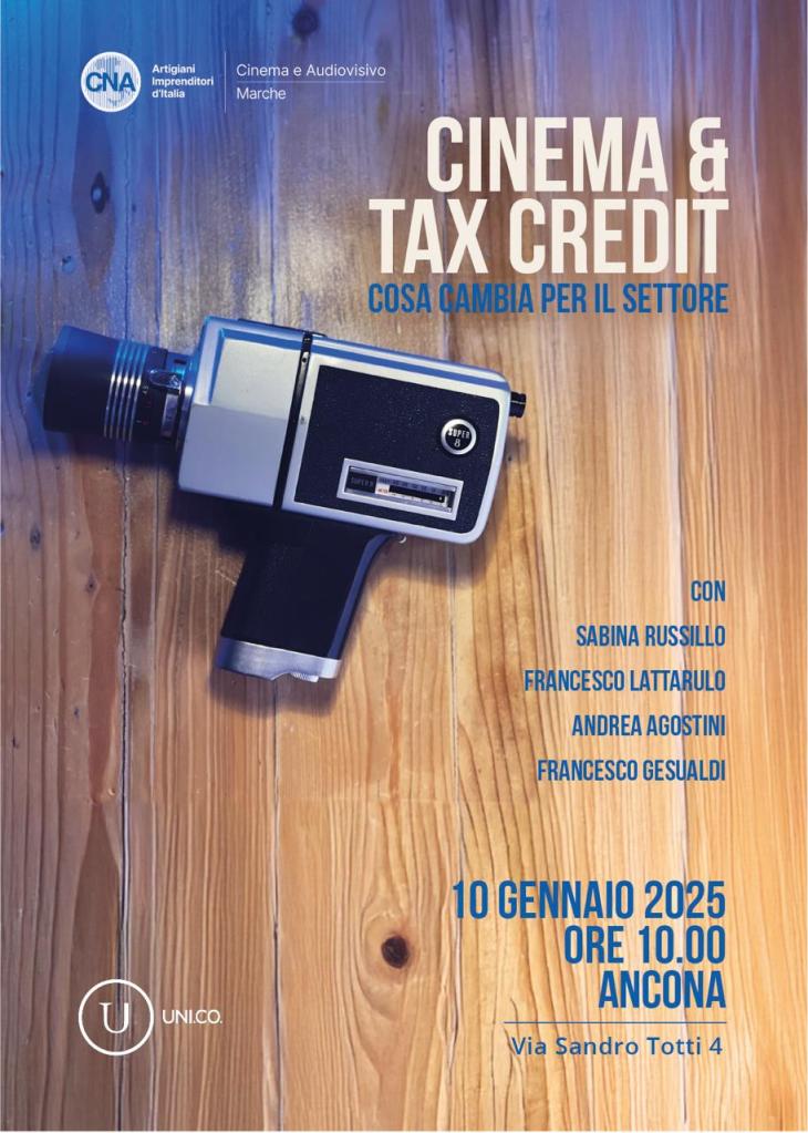 L’iniziativa, che ha il patrocinio del Confidi Uni.co. e la collaborazione di Fondazione Marche Cultura e Marche Film Commission si terrà ad Ancona domani, VENERDI’ 10 GENNAIO 2025 (inizio ore 10) nella sede CNA delle Marche in via Sandro Totti, 4 – zona Baraccola.