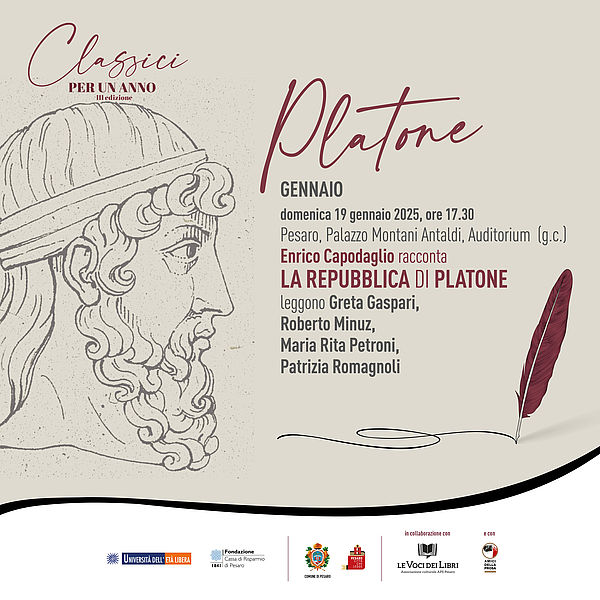 E’ il primo dei dodici appuntamenti della terza edizione della rassegna Classici per un anno. Domenica 19 gennaio, alle ore 17.30, nell’Auditorium di Palazzo Montani Antaldi (g.c.), Enrico Capodaglio racconta la Repubblica di Platone. Ad accompagnarlo, i lettori Greta Gaspari, Roberto Minuz, Maria Rita Petroni, Patrizia Romagnoli delle Voci dei Libri APS.