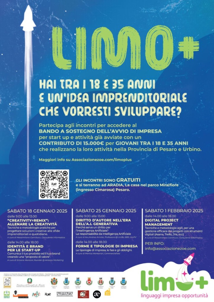 Sabato 25 gennaio, ad Aradia al Parco Miralfiore, doppio incontro gratuito: alle 9 sul ” Diritto d’autore nell’era dell’A.I. generativa”; alle 14 sulle “Forme e tipologie di Impresa”; si continua l’1 e il 7 febbraio con gli appuntamenti «per sostenere i giovani e prepararli alla partecipazione del bando collegato al progetto Limo+ che assegnerà 15mila euro a 5 progetti della provincia»