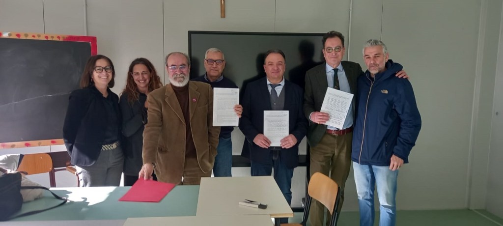 PIOBBICO – Il presidente Giuseppe Paolini e il direttore generale Marco Domenicucci hanno siglato in mattinata la convenzione con il Comune di Piobbico e l’Istituto Omnicomprensivo Celli-Michelini Tocci relativa all’utilizzo del palazzetto dello sport di proprietà della Provincia in località Isola per la palestra della scuola e per le associazioni e società sportive autorizzate dall’amministrazione comunale. La firma è avvenuta all’interno dell’Istituto Alberghiero, alla presenza del sindaco Alessandro Urbini, del segretario comunale Valeria Avaltroni, del responsabile tecnico Monia Ceccarelli, del consigliere comunale Walter Pazzaglia, del dirigente scolastico Luciano Antonelli e della vicepreside Antonella Painelli. «Con l’occasione – spiegano il presidente e il direttore – abbiamo fatto anche il punto sui lavori della Provincia per la nuova sede dell’Istituto Alberghiero. Dopo un anno e mezzo di cantiere l’intervento è in dirittura d’arrivo, in linea con i tempi. Nel mese di febbraio sono previsti i collaudi e a breve i ragazzi potranno entrare nella nuova scuola. Completamente antisismica, in legno e all’avanguardia sul piano dell’efficientamento energetico grazie alla classificazione ‘Nzeb’: un’operazione virtuosa che ci consentirà di risparmiare sull’affitto attuale, consegnando ai ragazzi una scuola sicura. Una bella notizia per un Istituto importante per l’entroterra», sottolineano Paolini e Domenicucci. L’investimento è di oltre cinque milioni di euro, con progetto finanziato grazie al Piano triennale regionale per l’edilizia scolastica. Dalla vecchia palestra, in aggiunta, sarà ricavata un’aula polivalente per la scuola. Soddisfatto il sindaco Urbini, che commenta così la firma odierna: «Abbiamo condiviso il progetto sul palasport nella sua interezza. C’era una difficoltà da parte del Comune per il mantenimento dell’impianto e la Provincia versava già un contributo per le attività dell’Alberghiero. Abbiamo quindi preferito non creare altre strutture ma valorizzare il palasport esistente, cedendolo alla Provincia in diritto di proprietà a fronte di un corrispettivo (250mila euro, ndr). Oggi arriviamo alla fine del percorso anche sul suo utilizzo che sarà a vantaggio della scuola e della comunità. Per questo ringrazio la Provincia per la collaborazione».