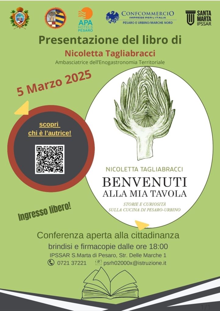 Con l’autrice, interverranno l’assessora del Comune di Pesaro Francesca Frenquellucci, il direttore di Confcommercio Marche Nord Agnese Trufelli, il presidente dell’associazione Ristoratori Mario Di Remigio e il presidente di Apa Marco Filippetti. Modera Fabio Ferrantino, chef e docente.