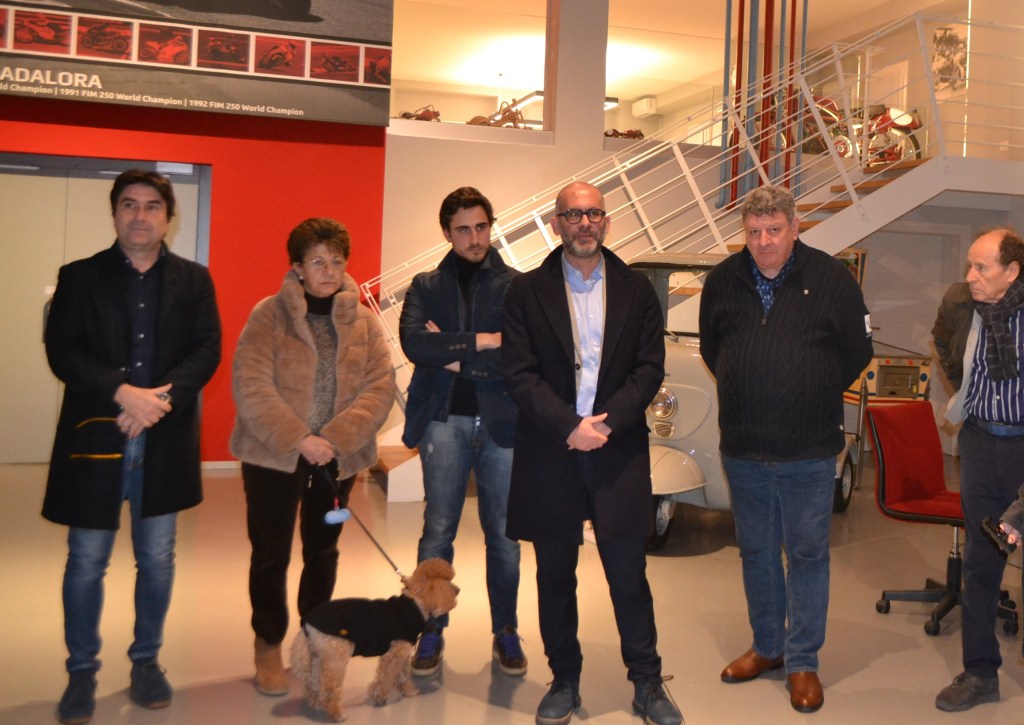 il presidente e il past president del Panathlon Club di Jesi, Andrea Moriconi e Fabio Fittajoli; Lauretta Micozzi, figlia dell’indimenticato Lauro Micozzi, grande collezionista e restauratore di Ducati e il Governatore Panathlon Area 5 Marche e Emilia Romagna, Stefano Ripanti: «Quando si parla di motociclismo pesarese, vuole dire che siamo su un altro pianeta. Il motociclismo che è nato a Pesaro, non solo come aziende, è forse uno dei punti focali dell’intero movimento italiano, europeo e mondiale. La collezione che abbiamo visitato, un’interessante raccolta di moto che si sono succedute nel tempo, mostra una lunga storia di passione. Penso che il motociclismo che esprimono le Marche, poche altre regioni possano vantarlo».